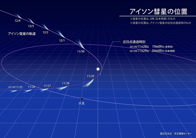 JUGEMテーマ:科学 かなり明るいかもしれない彗星が2013年11月ぐらいから見えるそうだ。 ちょっと楽しみだ。日が出ても見えるぐらい明るいかもと予測している人もいた。 ---引用 文章は短く編集した----------------------------------------------- 国立天文台http://www.nao.ac.jp/astro/sky/2013/ison.html アイソン彗星は、太陽に極端に近づく軌道を持っていることが分かっています。そして、太陽に最も近づく11月29日(日本時間)前後には、明るさがマイナス等級に達することが期待されています。ただし、...