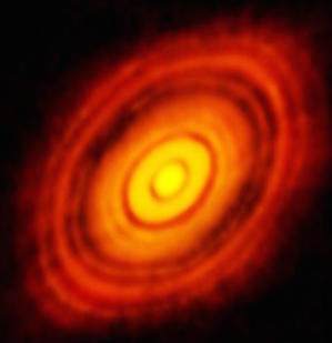 JUGEMテーマ:科学 誕生から約100万年後の若い恒星を取り囲むちりの円盤の中で、惑星が誕生しているとみられる現場を国立天文台などが南米チリのアルマ望遠鏡で初めて観測した。(略)ここでは1千万年以上にわたって、ちりが衝突を繰り返して合体し、惑星ができると考えられていた。研究チームは地球から約450光年離れた「おうし座HL星」を電波で10月に観測。ちりの円盤が幾重にも星を囲んでいる様子を鮮明に捉えた。円盤の大きさは太陽系の約3倍で、人間の「視力2千」に相当する史上最高の解像度で撮影に成功した。...