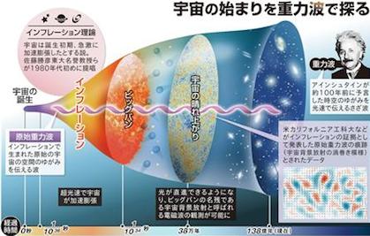 JUGEMテーマ:科学 宇宙は誕生初期に急膨張したとする「インフレーション理論」を観測で裏付ける研究が注目されている。太古の時空のゆがみを伝える「原始重力波」をとらえれば証拠となり、ノーベル賞級の大発見。米国などの研究チームが証拠を見つけたと発表し物理学界は一時沸いたが、確証を得るにはさらに高精度の観測が必要だ。宇宙は138億年前の誕生直後、超高温で超高密度の火の玉のような状態になり、爆発的に膨張する「ビッグバン」が起きた。その後は冷えて膨張も緩やかになり、現在の姿になった。ビッグバンがなぜ起...