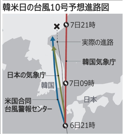 JUGEMテーマ:韓国ニュース 台風10号「HAISHEN」が7日午前9時ごろ、韓国蔚山海岸に上陸した。韓国気象庁は台風が東海岸に沿って北進すると予想したが、予想よりはやや西寄りに偏って陸地を経由した。だが、慶南内陸に上陸して韓半島(朝鮮半島)を貫くと予想した米軍合同台風警報センター(JTWC)や日本気象庁の予想に比べるとはるかに正確だった。済州大学台風予報センター長のムン・イルジュ教授は「予想とは違って台風は上陸したが、誤差の水準で見た時、おおむね正確」と話した。(略) https://news.yah...