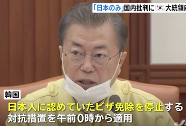 JUGEMテーマ:韓国ニュース 韓国大統領府は8日、韓国からの入国規制を行っている国のなかで「日本に対してのみ対抗措置をとった」との批判が出ていることに関連し、反論するコメントを発表しました。新型コロナウイルスの感染拡大を懸念して韓国からの入国を禁止・制限する国は100以上にのぼっていますが、韓国は日本人に対してこれまで認めていたビザの免除を停止する対抗措置を午前0時から適用することを決めています。これについて韓国大統領府は8日、コメントを出し「国民の安全を最優先にした決定だ」と説明。日本の...