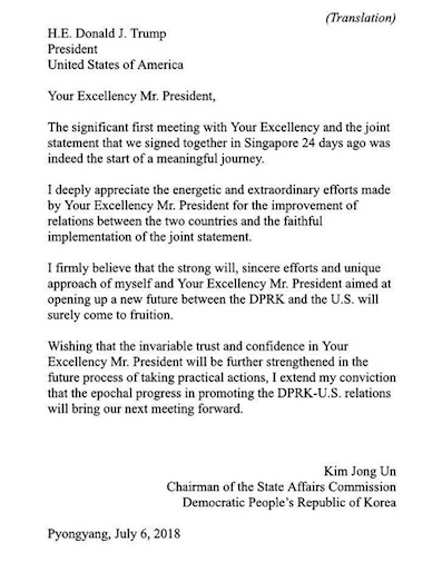 JUGEMテーマ:国際社会 JUGEMテーマ:北朝鮮 トランプ米大統領は12日、ポンペオ米国務長官が6〜7日の北朝鮮訪問時に預かった金正恩朝鮮労働党委員長の親書を自身のツイッターで公開した。親書には、トランプ氏の「精力的で並外れた努力に深く感謝する」と記されており、トランプ氏は「とてもすてきな手紙だ。(米朝交渉は)素晴らしく進展している!」とつぶやいた。トランプ氏のツイッターで公開されたのは、ハングルで書かれた正恩氏のサイン入りの親書と、その英訳の文書の2通。(略)米朝交渉をめぐっては、ポ...