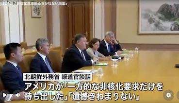 JUGEMテーマ:北朝鮮 平壌で2日間にわたって行われたアメリカのポンペオ国務長官と北朝鮮の金正恩委員長の側近との高官協議。アメリカ側が手応えを強調する一方で、北朝鮮側は、アメリカ側の態度を非難し、「非核化への意志が揺るぎかねない危険な局面」と強くけん制している。(略)北朝鮮外務省の報道官は、今回の交渉でアメリカが「一方的な非核化要求だけを持ち出した」として、「遺憾きわまりない」との談話を発表した。さらに、段階的な非核化を求める姿勢を改めて鮮明にし、「我々の非核化への意志が揺るぎかねない危険...