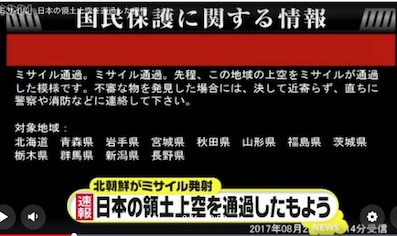 JUGEMテーマ:北朝鮮 北朝鮮から発射されたミサイルは8月29日午前6時6分ごろ、北海道襟裳岬の上空を通過し、(略)襟裳岬の東方約1180キロの太平洋上に落下したものと推定されています(略)ミサイル通過を受け、JR北海道は、一時、すべての電車の運転を見合わせていましたが、午前6時21分に運転を再開しました。一部の電車に運休や遅れが生じています。釧路市によりますと、市立小学校は通常通りに登校するということです。(略) https://headlines.yahoo.co.jp/hl?a= 20170829-00010000-hokkaibunv-hok ...