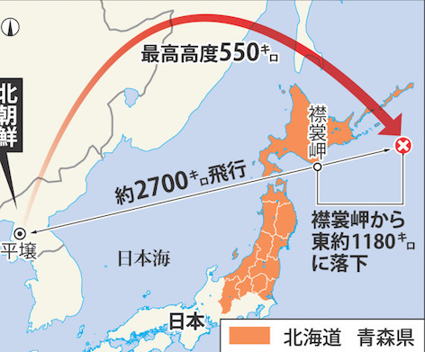 JUGEMテーマ:北朝鮮 政府は29日、北朝鮮が弾道ミサイル1発を発射したと発表した。ミサイルは北朝鮮西岸から午前5時58分ごろに発射され、北海道・襟裳岬の上空を通過して午前6時12分ごろに岬の東約1180キロの太平洋上に落下したと推定している。(略)日本政府や韓国軍合同参謀本部によると、ミサイルは平壌(ピョンヤン)・順安(スナン)付近から発射され、飛行距離は約2700キロ、最高高度は550キロ。(略) https://headlines.yahoo.co.jp/hl?a= 20170829-00000020-mai-pol &nbs...