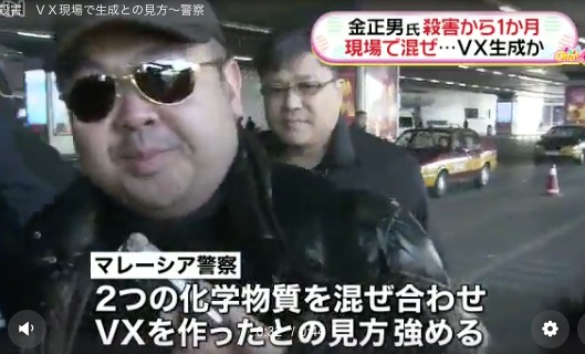 JUGEMテーマ:北朝鮮 (略)マレーシア警察は殺害に使われた猛毒の神経剤VXについて、正男氏の衣服などを調べた結果、2つの化学物質を現場で混ぜて作られたとの見方を強めている。この事件で正男氏は猛毒のVXを顔に塗りつけられて死亡したが、VXについて、警察は、2つの化学物質をフォン被告とシティ アイシャ被告それぞれが、正男氏の顔に塗りつける形で、混ぜ合わせ、作られたとの見方を強めていることがわかった。警察は防犯カメラなどの分析から、犯行時にフォン被告の手が抵抗した正男氏の上着に触れたとみている...