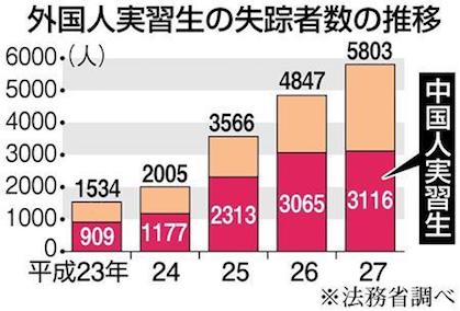 JUGEMテーマ:中国ニュース 働きながら技術を学ぶ「技能実習制度」で来日した外国人の失踪が昨年5800人を超え、過去最多に上ったことが30日、法務省への取材で分かった。全体の約半分が中国人で、(略)平成23年からの5年間で計1万人超が失踪している。多くが不法滞在となっているとみられ、国内の治安にも影響を与えかねないことから、捜査当局は警戒を強めている。(略)昨年の失踪者を国別にみると、中国が3116人で最も多く、ベトナム(1705人)、ミャンマー(336人)と続いた。中国人実習生の失踪は2...