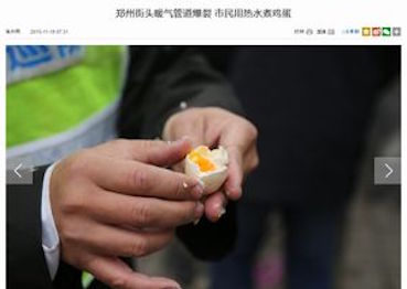 JUGEMテーマ:中国ニュース 中国メディア「チャイナデーリー」系列の華字ニュースサイトの中国日報中文網によると、河南省鄭州市内の紅旗路で18日日、地下に敷設していた地域集中暖房の熱水パイプが「爆裂」し、大量の熱水が地面に噴出した。周囲からから住民が集まり、流れる熱水に卵を浸して、ゆで卵を作るなどで利用した。(略)熱水には圧力が欠けられており、パイプが破損すると、中国でしばしば見られる水道管の「爆裂」と同様に水が噴き出す。(略)修理に駆けつけた集中暖房運営会社の係員は、「湧き出した熱水の温度は...