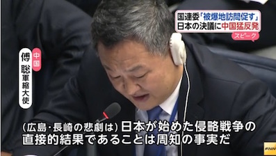 JUGEMテーマ:中国ニュース 国連総会の委員会で2日、核兵器の廃絶に向け、「被爆地の訪問」を世界の指導者に促すことを盛り込んだ日本の決議が採択されたが、中国が、これに激しく反発した。日本政府が提出した決議は、核兵器の廃絶に向け、世界の指導者や若者に、被爆地を訪問するよう促すもので、156カ国の賛成多数で採択された。中国の傅聡軍縮大使は「(広島・長崎の悲劇は)日本が始めた侵略戦争の直接的結果であることは、周知の事実だ」と述べた。傅聡大使は、「広島・長崎への原爆投下は、日本の軍国主義の結果であり、誰が...