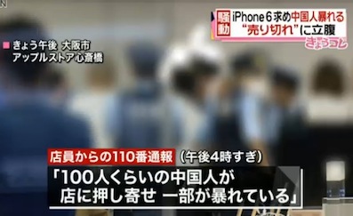 JUGEMテーマ:中国ニュース 19日にアップルの「iPhone6」と「iPhone6Plus」が発売となり、大阪・心斎橋のアップルストアでは、多くの中国人が店に押し寄せ警察が出動する事態となった。大阪市中央区にある「アップルストア心斎橋」で、午後4時過ぎ、店員から「100人くらいの中国人が店に押し寄せ、一部が暴れている」と110番通報があった。警察などによると、19日発売のiPhone6を求めて並んでいた多くの中国人が、希望する端末が売り切れていることに腹を立て店に抗議していたという。今のと...
