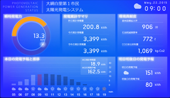 大網白里第1市民発電所の発電状況は、ソーラー・エナジー・ソリューションズ社製のソーラーモニターというシステムによってリアルタイムに確認できます。下の画像をクリックするとモニター画面に遷移します。