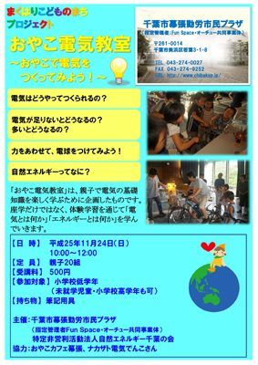 11月24日に開かれるイベント「おやこ電気教室 おやこで電気をつくってみよう!」のフライヤーができました。ポスターも同じデザインです。 ほしい方は、千葉市幕張勤労市民プラザにあります。 PDFでほしい方は、こちらからダウンロードできます。 → おやこ電気教室フライヤー (この事業はパルシステム千葉NPO助成基金の助成により運営されます。)
