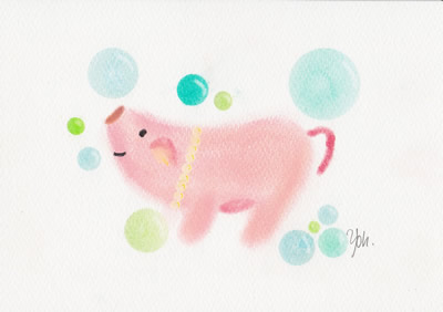先日描いた豚に真珠のぶーちゃん。 これをあえて2月の絵にすることにして、 カレンダー用に描き直しました。 豚は縁起物の動物で、富と繁栄の動物として 貯金箱にもよく使われていますね。 そう、この真珠は無駄であるものの象徴ではなく、 繁栄の結果、身につけている財産なのだと都合良く解釈することにし、 新年を迎える2月にしたのです。 タイトルの「恭喜發財」は「gōngxǐ fācái」と発音します。 新年にはお金の神様を迎える「迎財神」の儀式もあります(豚は 関係ないですけどね)。 ...