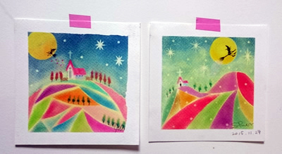 久しぶりのヨルツバメは、オデカケツバメ。 最近、つばめのおやどはいろんなものが壊れ、 次から次へと修理の嵐が吹き荒れていたため、 お出かけさせていただきました。 お相手はヨルツバメ常連のjinjingちゃん。 今回は『四季の丘の上の教会』を二人で描きます。 丘の部分の描き方に驚くことしきり。 細谷代表はどうしてこんなおもしろい描き方を発想できるのか 不思議だね〜なんて言いながら、作品を仕上げていきました。 二人とも思っていたような空の色が出せませんでしたが、何とか完成。 jinjingちゃんは意...