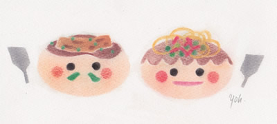 いや〜、これも「使い回しやん!」の決定版みたいなものなんですが、 10月はお好み焼きとモダン焼きの絵で。 これはまだWindowsマシンを使っていた頃、 Win95に付属していたペイントというソフトとマウスで描いた、 『お好みパパとモダンママ with たこやっちゃんズ』が元絵です。 後にMacを使うようになって、Aiで描きなおした際に、 パパのひげにちょっとRをつけたり、絵をふちどっていた黒い線を やめたり修正しました。 一時は名刺にも使用していたので、ご存知の方も少なくないかもしれません。 で、何で10月が...