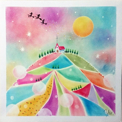 ようやく10月27日のWSの準備に入りました。ゆうべは、毎回会場に掲示するその月の絵の30センチ角ヴァージョンを描きました。紙が大きい分だけ丘の部分の塗りの粗さが気になって、しばらくう〜んとうなっていましたが、空とお月様はとても気に入っています。空の色は私にしては珍しい雰囲気になっているのではないでしょうか。魔法使いさんたちがどの辺りを飛んでいる時の絵にするか、月のそばを飛んでいるところにするととても映えるとわかっていつつも、あえて異なる配置にしてみました。そうそう、柵も忘れず描きました。ちょ...