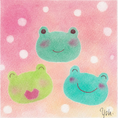 26日、2枚めはパステルで遊びながら笑っているココロンの3人をカエルちゃんにしてみました。娘に「どれが誰だかわかる?」とたずねてみたところ、P!-mamaちゃんとの面識はほとんどないのにすぐに全部当てられてしまいました。またココロン5人全員で絵が描ける日が来ると嬉しいな。JUGEMテーマ:パステルアート