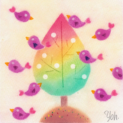 ゆうべのヨルツバメで描いた絵です。謎の生き物(いつの間にかそのようなことに)が、木の実を食べにきたり、食べ終えて離れていったり。挿絵のような感じに仕上がったので枠はつけませんでした。羽がひれのように見えるので、鳥とも魚とも……という感じになったのでしょうね。その羽と目は色鉛筆で描きました。いかにもつばくろん、なマットな仕上がりの絵です。JUGEMテーマ:パステルアート