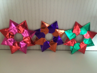 カラーホイルでゴージャスに! JUGEMテーマ:折り紙 ●How long will it take to complete the Origami? 65 minutes ●How difficult? (★1 easy to 5 difficult) 5 ★★★★★ ●What is the material? Origami Hoil 7.5 cm x 7.5 cm 8 sheets X 3 ●How much do I like it? (☆1 to 5) 5☆☆☆☆☆ ホイル紙を使うと、きれいに折り目をつけるのにどうしても時間がかかってしまいます。 でも、見た目はゴージャスで、千代紙とは違ってゴージャスに!
