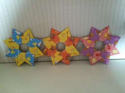 お誕生日会の飾り付けに。 ●How long will it take to complete the Origami? 45 minutes ●How difficult? (★1 easy to 5 difficult) 4 ★★★★ ●What is the material? Origami Chiyogami 7.5 cm x 7.5 cm 8 sheets X 3 ●How much do I like it? (☆1 to 5) 5☆☆☆☆☆ 同じ形を沢山作る作業は、回数を重ねる毎にきれいに早く折れるので好きです。 JUGEMテーマ:折り紙