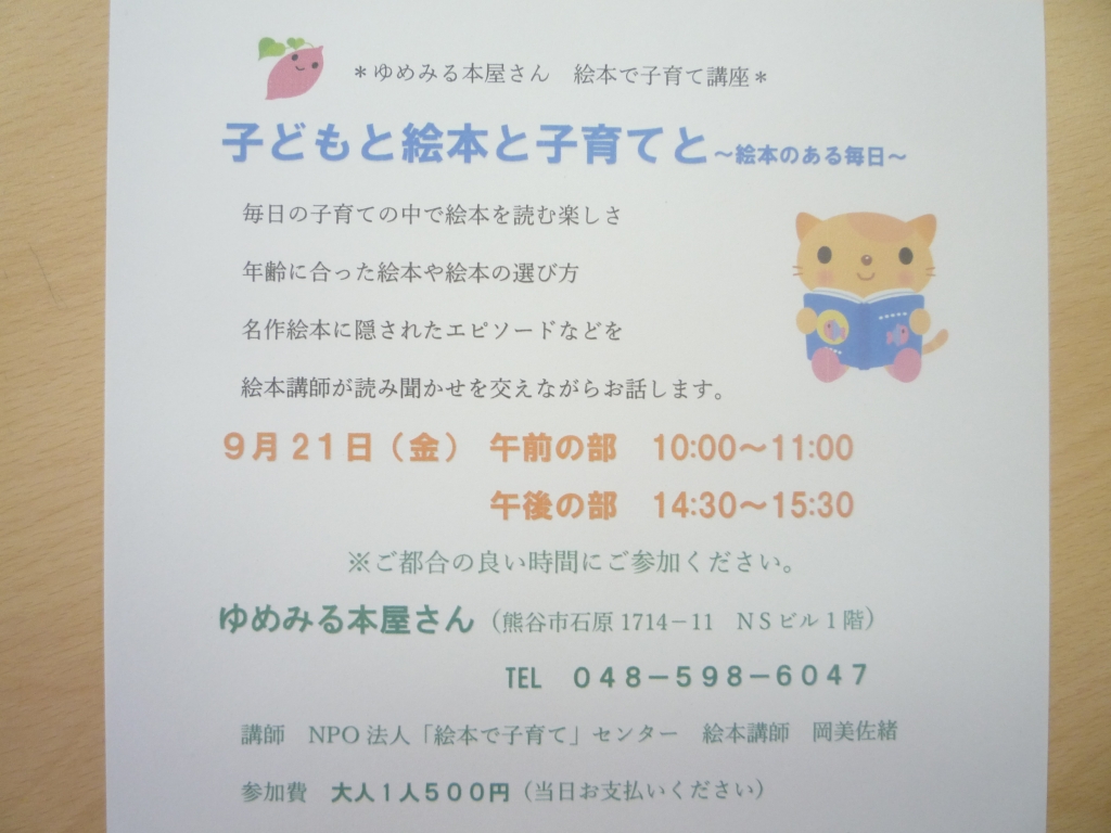 JUGEMテーマ:童画・絵本 9月21日(金)に、絵本で子育て講座『子どもと絵本と子育てと〜絵本のある毎日〜』を開催します。 絵本は今、色々なところでも取り上げられ、本屋さんに行けば様々な絵本が並んでいますね! 我が家は図書館もよく利用しています(^-^) けれど、たくさんの絵本があるなかで、お子さんやお孫さんに 「どんな絵本を選んだら良いか分からない」 「絵本の読み聞かせって、どのようにすれば良いの?」 などのお悩みをお持ちになったことはありませんか? 今回、...