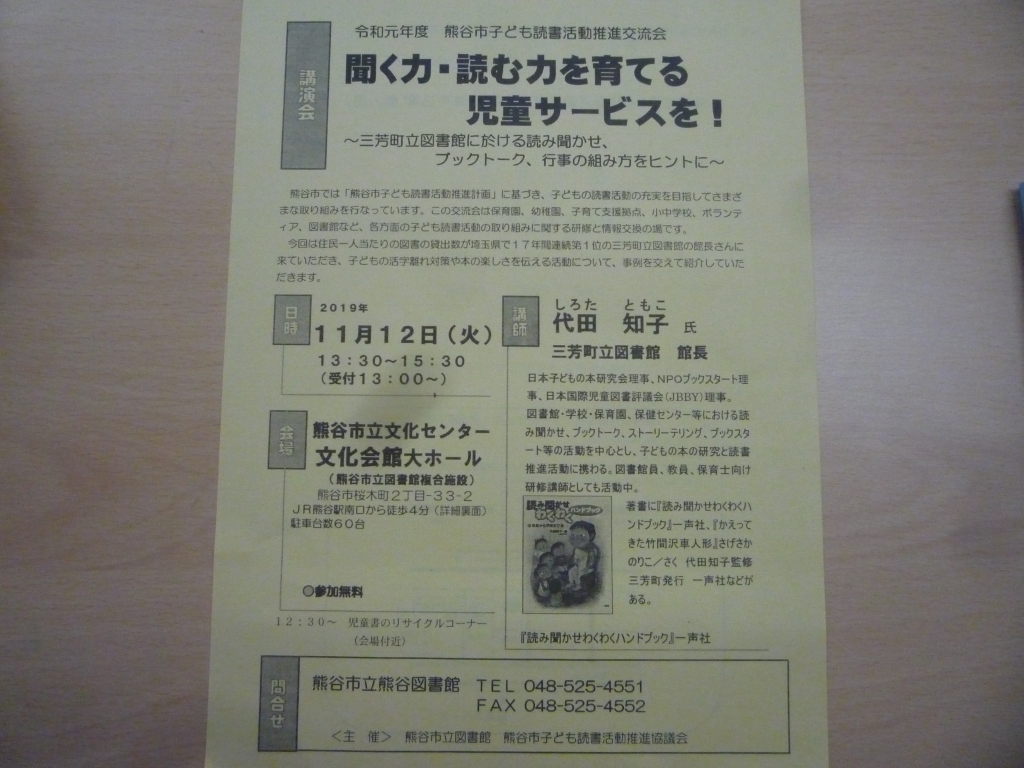 JUGEMテーマ:童画・絵本 こんにちは。絵本と雑貨の店「ゆめみる本屋さん」の老川です。 朝晩が冷え込むようになってきましたね。 昨日、熊谷市立図書館 熊谷市子ども読書活動推進協議会さま主催の講演会に行ってきました。 『聞く力・読む力を育てる児童サービスを!〜三芳町立図書館に於ける読み聞かせ、ブックトーク、行事の組み方をヒントに〜』 講師は、住民一人当たりの図書の貸出数が埼玉県内で17年連続第1位の三芳町立図書館の館長さんである代田 知子さんでした。 &nbs...