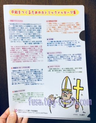JUGEMテーマ:イラストレーター (↑クリックすると大きくなります ★画像のメアドは、現物には入っていません) ローマ教皇フランシスコのイラストのA4クリアファイルができました もともとは、小冊子の中で描かせていただいたイラストでした。 裏は透明なので、使いやすいです 特に、くわしく内容はありませんが、下記リンクいたします。 文章と作成元:日本カトリック正義と平和協議会 URL: htt...