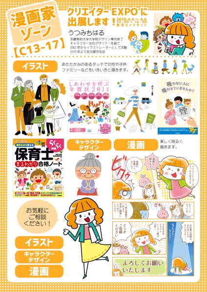 第7回クリエイターEXPOに初出展します! 2018年4月4日(水)〜6日(金) 会場 東京ビッグサイト http://www.creator-expo.jp/ ご来場には招待状が必要となります。 お送りさせていただきますので当方までご連絡くださいませ。 ブースは「漫画家ゾーン」C13-17になります。 無料パンフレットをご用意しております。 どうぞよろしくお願いいたします。