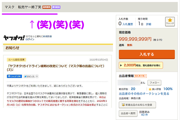 3月5日からヤフオクですごいことになってる(笑) ホワイトデーに良いプレゼントになるね^^ 小生も見かけたら通報しまくろうっと〜♪ 楽しみだなああああ(口笛〜♪) そして、ヤフオクのマスク出品の現在がこちら⬇︎ 入札価格 99億9999万9999円(笑)(笑)(笑) 現在、テンバイヤーが焦って在庫をまとめて出品するも、億単位のイタズラ入札で逃げ売り阻止している模様。 なんと手に汗握る激アツな戦いだろうか(笑) いいぞーもっとやれーw