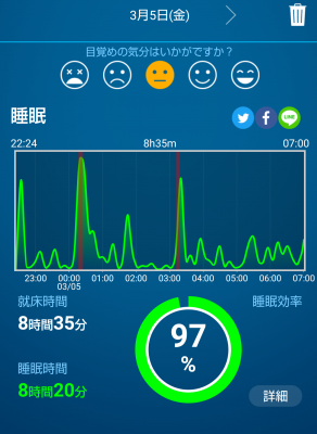 3月5日(金) 流れで 熟睡アラームのアプリを インストールしてみる 初日は気になって 眠れなかったけど なぜか(笑) それに 自分ではよく眠れてないし 入眠までに時間がかかってるものも 1分くらいで入眠になってるのは ????? な感じ 少し遠いところに置いてるからかな? 波形もいまいち分からないけど 調子の良い時悪い時は やっぱり睡眠の質が関係していた と言うのが如実にわかって 非常に面白い♪ 睡眠の質を高めるべく 動き出す の あれから アプリを使ってから 睡眠...