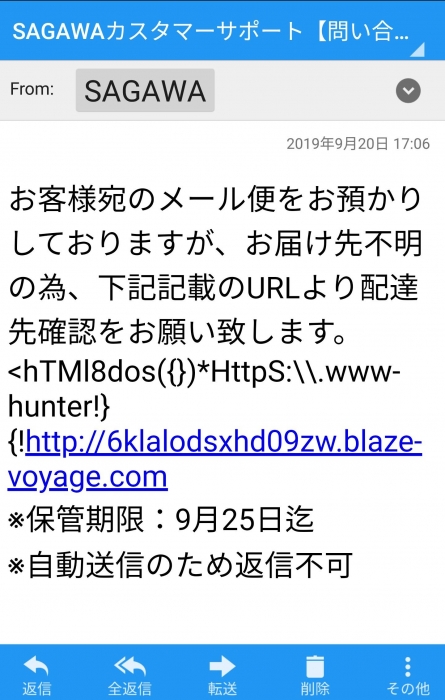 JUGEMテーマ:迷惑メールカタログ 最近、新たな迷惑メールが頻繁に、来はじめました。 今までは、ショートメールで来ていて分かりやすかったのですが、スマホの携帯会社のアカウントのメールアドレスに届くんです。 しかも、解読不可能な複雑なメールアドレスにしてあるのに!です! 情報漏洩としか思えません。怖いです。 最初に慌てて、SAGAWA のメールのURLをクリックしてしまいましたが、それだけでは大丈夫な様です。   パターン1     パターン2   &nb...