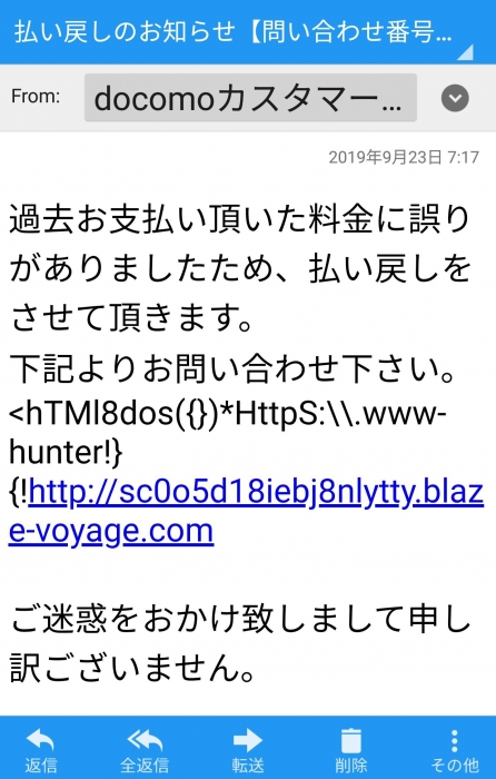JUGEMテーマ:インターネット JUGEMテーマ:迷惑メールカタログ      数日前と今日、SMSとメールとにそれぞれ詐欺メールが到着しました。    まずはSMSから。送り元番号は、090-8318-1628 だったので、ブラックリスト入りですね。 内容は「 【国税庁9月2日】未払い税金お支払いのお願い。詳細はこちら。https://cutt.ly/0CiE4Lv 」  もちろんクリックじゃなかった、タップしちゃダメですよん。  urlアドレスは、疑惑てんこ盛りの、これぞ詐欺メールがクリックさせるurlの...