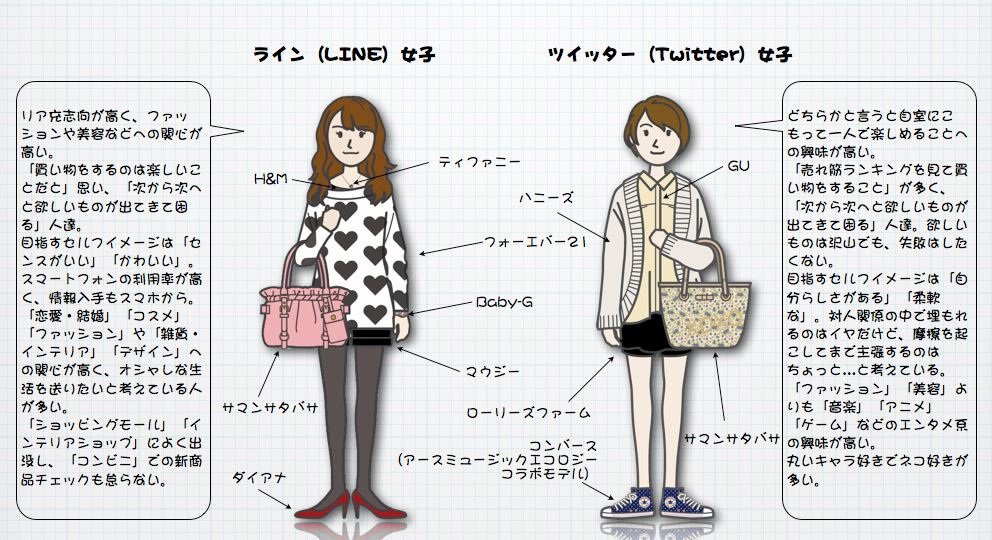 JUGEMテーマ:ソーシャル・メディア 年齢層はどちらも10〜20代層が多いけど、LINE派のほうが低年齢層寄り・ Twitter派の方が年齢層が幅広いんだそうです。 趣味や関心・興味事でいうとLINE派はアクティブ志向、Twitter派は インドア志向が強い、という統計だそうです。 ちなみに飼っているペットではLINE派が小型犬・ Twitte派は猫、という方が多いそうです。 ファッションや美容などへのアプローチですが、年齢層的にも このジャンルに対して両派とも興味・関心が高いの...