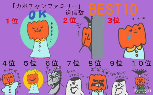 JUGEMテーマ:LINEスタンプ いつもナリタロのラインスタンプをつかってくれてありがとうございます。 12月に新作スタンプを発売します。 新作発売前に「カボチャンファミリー」の送信数BEST10を発表します! (次回は「みどり色ですね」のBEST10を発表します。) 人気BEST10ではありません。 送信数のBEST10です。 みなさんが良く使ってくれている順のBEST10です。 集計期間は9月12日の発売から11月30日までの期間です。 さっそく発表します! 10位「アッパレ...