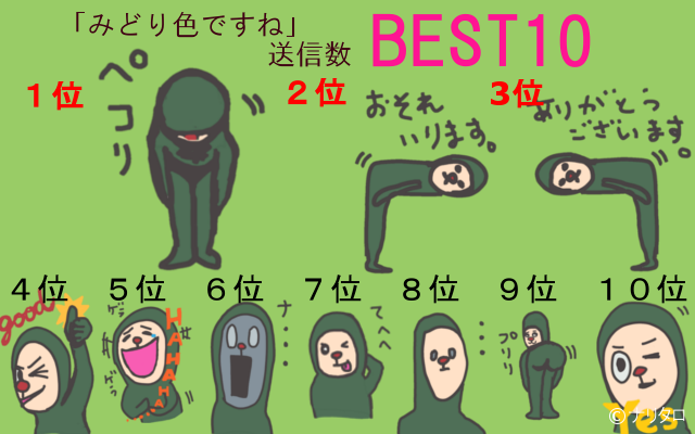 JUGEMテーマ:LINEスタンプ いつもナリタロのLINEスタンプをつかってくれてありがとうございます。 今回は人気スタンプ「みどり色ですね」の送信数BEST10を発表します! 人気BEST10ではなく送信数のBEST10です。 「みどり色ですね」は人気のスタンプで、送信数も受信数も特に多いスタンプです。 ありがとうございます! 集計期間は発売の9月12日から11月30日までです。 早速発表します! 10位「Yes」 9位「プリリ」 8位「・・・」 7位「てへへ」 6位「な・・・」...