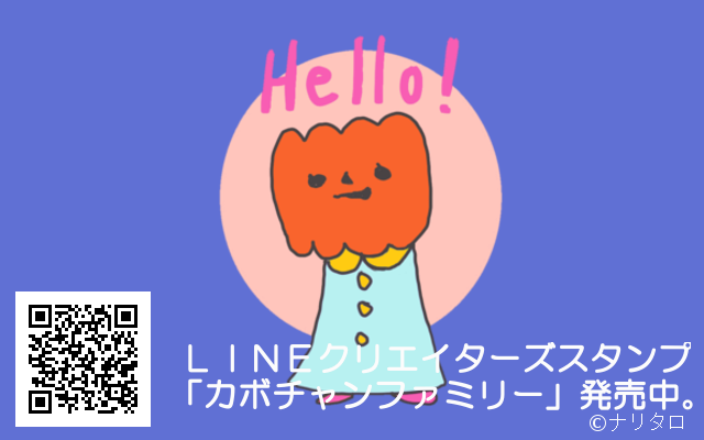 JUGEMテーマ:LINEスタンプ いつもナリタロのLINEスタンプをご利用いただきありがとうございます。 さて、本日9月12日に以下2つの新作LINEスタンプを発売しました。 ・「カボチャンファミリー」 →カボチャンはハロウィンが大好きです。カボチャンファミリーはカボチャンとお父さんのチチカボチャン、お母さんのハハカボチャン、バケゾウオジサンです。 ・「みどり色ですね」 →「なんか今、みどり色のスタンプが使いたいな。」って気分の時とかに使ってください。 発売中の ...