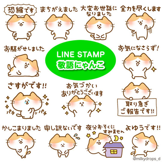 LINEスタンプ第9段『敬語にゃんこ』をリリース中です。 去年リリースしたLINEスタンプです。 制作時間:18時間/Photoshop CS4 ⇒購入ページ:LINE STORE 敬語をしゃべるネコのスタンプです。年上の方、仲の良い上司や先輩などに使って下さい! このスタンプは、描画じたいはあんまり時間かからなかったのですが、言葉決めるのに時間がかかってしまいました… *☆*:;;;:*☆**☆*:;;;:*☆**☆*:;;;:*☆**☆*:;;;:*☆* 現在リリース中のスタンプです。 ■⇒MilkyDropsのスタンプ一覧はコチラ JUGEMテーマ:LINEス...