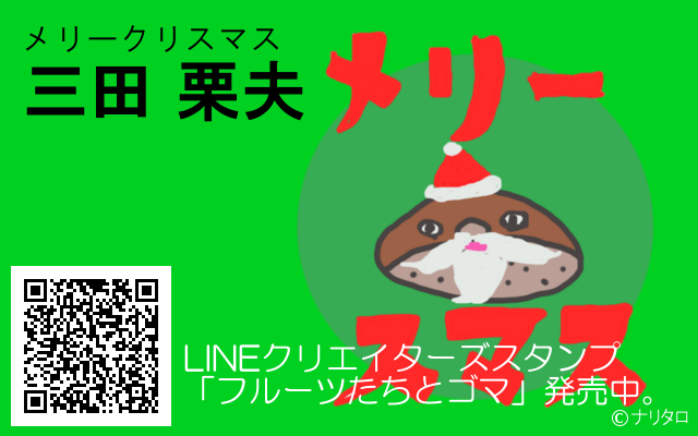 JUGEMテーマ:LINEスタンプ 三田 栗夫 メリークリスマス。三田栗夫は、 LINEクリエイターズスタンプ「フルーツたちとゴマ」のキャラクターです。 きよしこの夜に登場するのは三田栗夫。 ●三田栗夫(1種類) ・「メリー栗スマス」 LINEクリエイターズスタンプ「フルーツたちとゴマ」発売中です。 <おいしい栗の見分け方> 皮に張りと光沢がある栗。 固くてずっしり重い栗。 水に入れたら沈む栗。 【NEWS】 新作のLINEスタンプを6月6日に発売します。 COMING S...