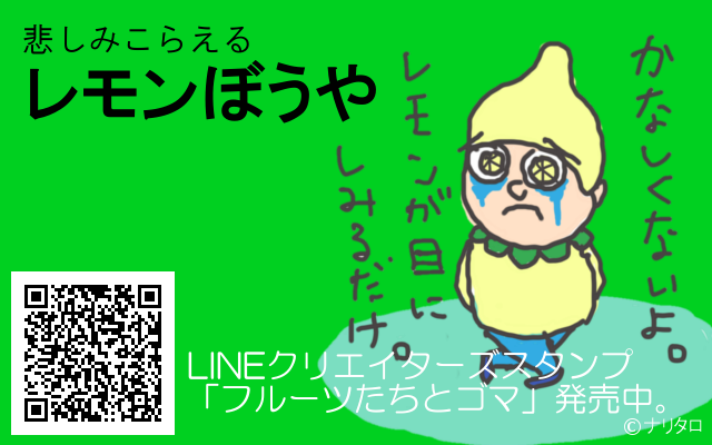 JUGEMテーマ:LINEスタンプ レモンぼうや 悲しみこらえるレモンぼうやは、 LINEクリエイターズスタンプ「フルーツたちとゴマ」のキャラクターです。 悲しくなんかない・・・レモンが、レモンが目にしみるだけなんだ・・・ ●レモンぼうや(1種類) 「かなしくないよ。レモンが目にしみるだけ。」 LINEクリエイターズスタンプ「フルーツたちとゴマ」発売中です。 <おいしいレモンの見分け方> 皮に張りがありずっしり重いレモン。 色鮮やかでしわが少ないレモン(きれいすぎるレモンは農薬...