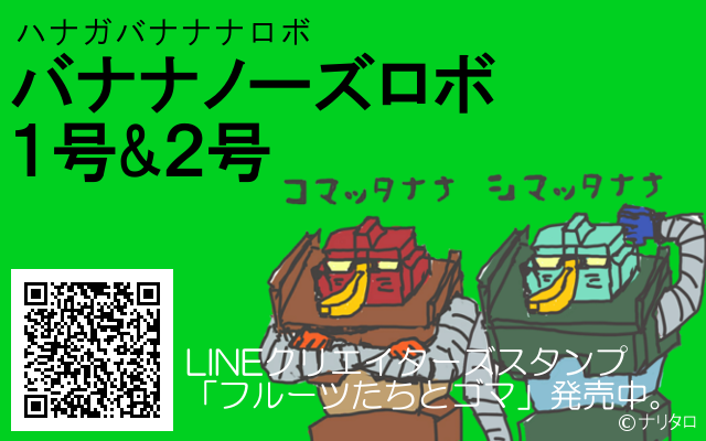 JUGEMテーマ:LINEスタンプ バナナノーズロボ1号&2号 ハナがバナナなバナナノーズロボ1号&2号は、 LINEクリエイターズスタンプ「フルーツたちとゴマ」のキャラクターです。 バナナノーズロボ1号&2号はドジで、よく困ったり、失敗したりします。 ●バナナノーズロボ1号(1種類) 「コマッタナナ」 ●バナナノーズロボ2号(1種類) 「シマッタナナ」 LINEクリエイターズスタンプ「フルーツたちとゴマ」発売中です。 <おいしいバナナの見分け方> 黒い斑点のあるバナナ...