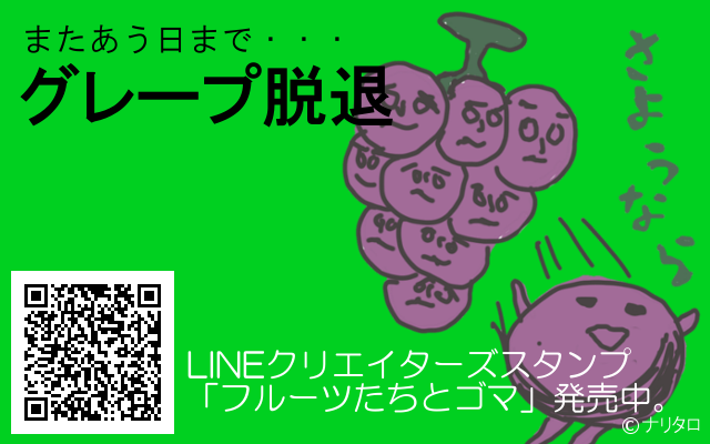 JUGEMテーマ:LINEスタンプ グレープ脱退 またあう日まで・・・グレープ脱退は、 LINEクリエイターズスタンプ「フルーツたちとゴマ」のキャラクターです。 さようなら・・・ ●グレープ脱退(1種類) ・「さようなら」 LINEクリエイターズスタンプ「フルーツたちとゴマ」発売中です。 <おいしいぶどうの見分け方> 実同士の間隔があいているぶどう。 皮の表面に白い粉が付いているぶどう。 軸が青々としているぶどう。 【NEWS】 新作スタンプ6月6日発売! COMING S...
