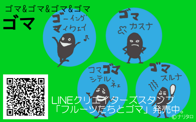 JUGEMテーマ:LINEスタンプ いつもナリタロのLINEスタンプ「フルーツたちとゴマ」をご利用いただきありがとうございます。 このブログでは、LINEスタンプ「フルーツたちとゴマ」の各キャラの紹介をしてきました。 このブログの各キャラクターの名前や紹介をみて、さらに楽しく使ってもらえるとうれしいです。 さて、この度新たに承認された新作LINEスタンプの「オバケのバケタ」を6月6日(あさって)発売いたします。 「フルーツたちとゴマ」を使っていただいている方も、使っていない方もよ...