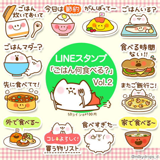 先週、LINEスタンプ第6弾をリリースしました。 第6弾は、前回リリースした『ごはん何食べる?』のVol.2です。 制作時間:21時間半 /Photoshop CS4 ⇒購入ページ:LINE STORE Vol.2は、ごはん関連の連絡系を中心にしてみました。文言はVol.1の時にはぶいた物が殆どなので、内容考えるのは1時間くらいで終わりました。プラス描画から申請データ完成までが20時間ちょっと…といった感じです。 審査期間は約1ヶ月。リリーズ中のスタンプの第二弾だったので早いのかなと思ったけど、同じキャラでも遅い人もいるみたいなのでや...