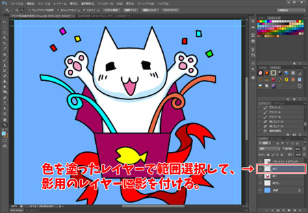JUGEMテーマ:LINEスタンプ さてさて、色を付けたら影をつけていきまーす。 デブクマの時と同じく、影を付けたい範囲を選択します。 色を付けたレイヤーに対して、 自動選択ツールで範囲を選択したら、 かげ用のレイヤーにブラシツールで影を描いていきます。 今回、箱内側の影は、それぞれの範囲をコピーした新規レイヤーに、 グラデーションオーバーレイを適用して表現しました。 他にもやり方はたくさんあるのですが、このほうが簡単じゃん。 というやり方があったらぜひ教えて下さい。 選択...