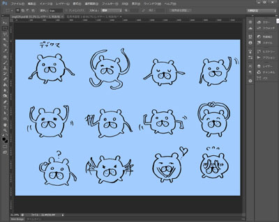 JUGEMテーマ:LINEスタンプ さて、手書き文字の取り込みについてです。 スキャンしたものがこちらです。 間違ったとこは適当になおしちゃってます。 余計なとこは後で消しちゃいますし、ほら、そのー、 紙がもったいないので(〃ノωノ) これをPhotoshopで開いて、2階調化します。 メニューのイメージ > 色調補正 > 2階調化 でできます。 しきい値は210で2階調化してみました。 文字以外を白く塗ってキレイにします。 自動選択ツールで許容値をゼロにして隣接のチェックを外し...