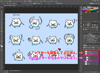 JUGEMテーマ:LINEスタンプ 影を付けたら、切り出し用のレイヤーをつくっちゃいます。 イラストレイヤーと影レイヤーを複製して、 フォルダを作って、複製の元のレイヤー入れておきます。 元のレイヤーはフォルダごと非表示にしちゃって、 複製したレイヤーを使っていきます。 影レイヤーの不透明度を調節して、違和感のない濃さします。 今回の私の場合、不透明度を40%にしました。 いい感じになったら、複製したイラストレイヤーと影レイヤーを結合しちゃいます。 コピーした2枚のレイヤーを...
