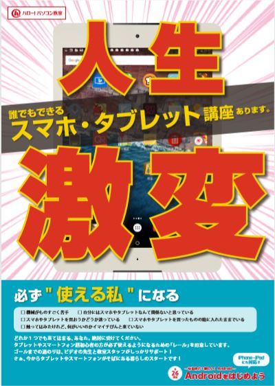 JUGEMテーマ:スマホ こんにちは!! 鶴見駅から徒歩10分! イトーヨーカドー鶴見店2F!! ハローパソコン教室イトーヨーカドー鶴見校 教室インストラクターの佐藤です。 10月に入って半月近く、暑かったりものすごい台風が来たりで運動会や学園祭が延期になったりと波乱万丈な秋ですね。天気予報や緊急な上に多くの方との連絡や交通手段の確認に避難場所や警戒情報確認・・・スマホが役に立つ、スマホのおかげで対応ができた等、スマホを持っていれば安心な機会がたくさん有りました...