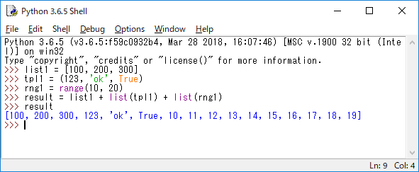 JUGEMテーマ:python リスト、タプル、レンジの3つは、いずれもシーケンスです。すべてインデクスで値が管理されており、インデクス番号で値を取り出せます。またシーケンス演算にも対応しており、使い方も非常に近いものがあります。ただし、細かな働きなどは違うため、まったく同じものとしては扱えません。例えばたリストとタプルを+演算子で1つにつなげることはできません。こうした場合、タプルからリストに変換する作業が必要になってきます。 構文 list(値) リストに変換する。