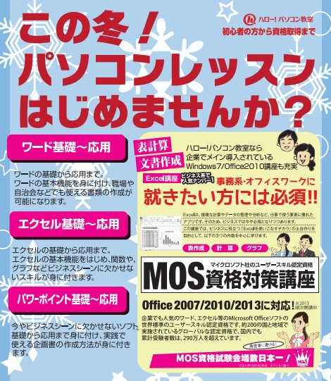 札幌市西区発寒8条12丁目、ハロー!パソコン教室イオンモール札幌発寒校、 教室インストラクターの袖岡です。 この冬、パソコンのスキルアップをお考えの方に とっても大事なお知らせです! ハローパソコン教室 イオンモール札幌発寒校では Word・Excel・PowerPoint の基礎から応用、 さらにはMOS取得の為の対策講座まで 皆様のニーズに合わせた講座を幅広く揃えております! 4月から新社会人になる皆様! 是非冬休みを利用して、パソコンスキルの向上と MOS取得までチャレンジしてみましょう! ハ...