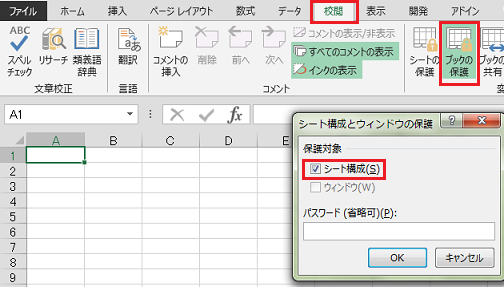 JUGEMテーマ:PC関連シートを削除したり移動したりできなくする場合や、ウィンドウのサイズ、ウィンドウ枠の固定の設定を変更したりできなくするには、ブックの保護を使います。Excel2003の場合:[ツール]-[保護]-[ブックの保護]を選び、保護したい項目にチェックを入れOKします。Excel2007,Excel2010,Excel2013の場合:[校閲]-[ブックの保護]を選び、保護したい項目にチェックを入れOKします。※Excel2010以降は[ファイル]-[情報]-[ブックの保護]からも選べます。※Excel2013では[ウィンドウ]にはチェックできません。